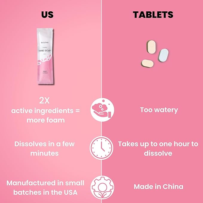 - NO MORE WATERY SOAP: Unlike foaming hand soap tablets that often feel thin and ineffective, our concentrated hand soap powder is packed with 2-3x more active ingredients. The result? A rich, creamy foam with every pump that actually feels like soap, leaving your hands clean, fresh, and moisturized every time.