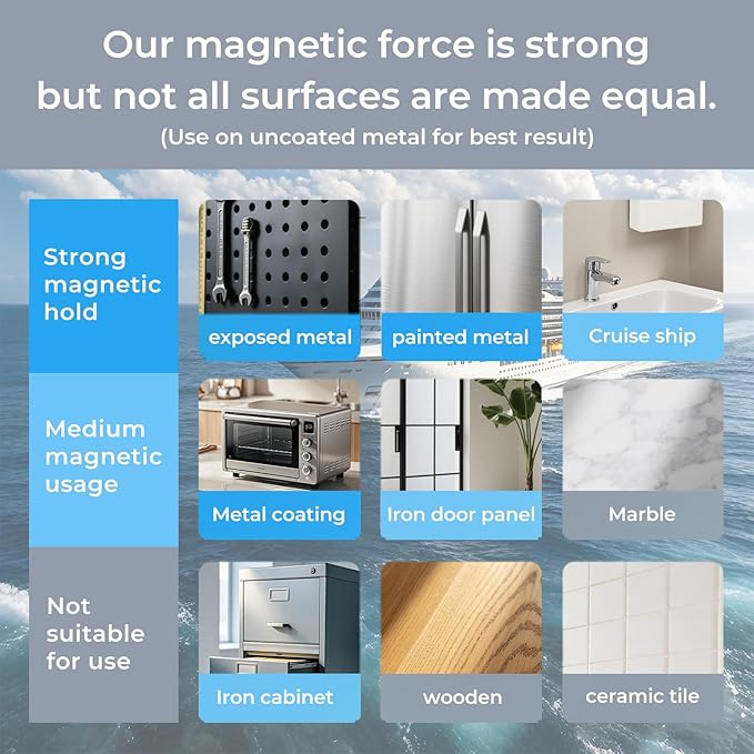 - STRONG MAGNETIC SUCTION – DESIGNED FOR CRUISE CABINS: Equipped with upgraded magnetic plates that attach firmly to smooth metal surfaces in your cruise ship cabin—such as cabin doors or bathroom walls. No drilling, no residue.