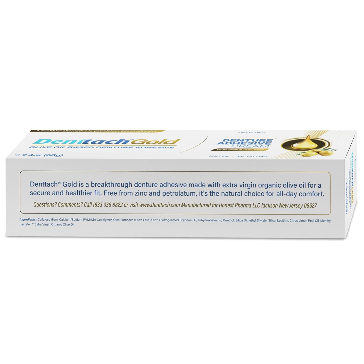 Denttach Gold Denture Adhesive, Petroleum Free Olive Oil Based Premium Denture Adhesive Cream for Full and Partial Dentures, All Day Secure Hold Denture Glue, Zinc Free, 2.4 Ounce (Pack of 2)