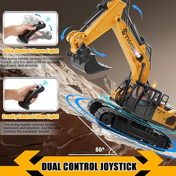 - 【Powerful, Flexible And Free Play】KIZJORYA remote control excavator toy With built-in 11 channel, 2.4 GHz and a wireless infrared gravity induction remote control. Breaking the traditional 680° limitation, you can easily control this excavator toy to drive in any direction and rotate the excavator body in all directions. Moving forward, turning left, digging, rotating and unloading, there are more combinations of operation waiting for you to explore!
