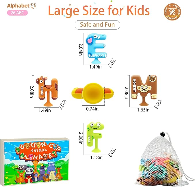 - Suction Cup Letters: 26 alphabet suction letters, used as a letter preschool learning abc tools or as suction cup toys for toddlers in the bathroom.They make bath time more fun and are the perfect bath toys for toddlers