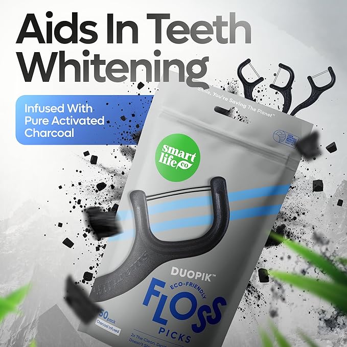 SmartLifeco Eco-Friendly Dual-Thread Dental Floss Picks (100ct) - Flossers Made with Straw Wheat Blend, Natural Teeth Whitening, Tooth Pick Stick for Adults, Activated Bamboo Charcoal Floss Thread