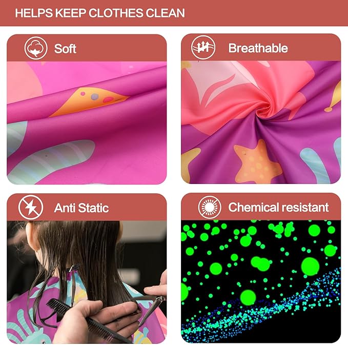 - 【PERFECT HAIRCUT CAPE FOR KIDS】- Protect kids from hair and chemicals with our barber capes; This hairdressers cape Allows the hair to slide right off and prevents trimmings from sticking or clinging to the clothes
