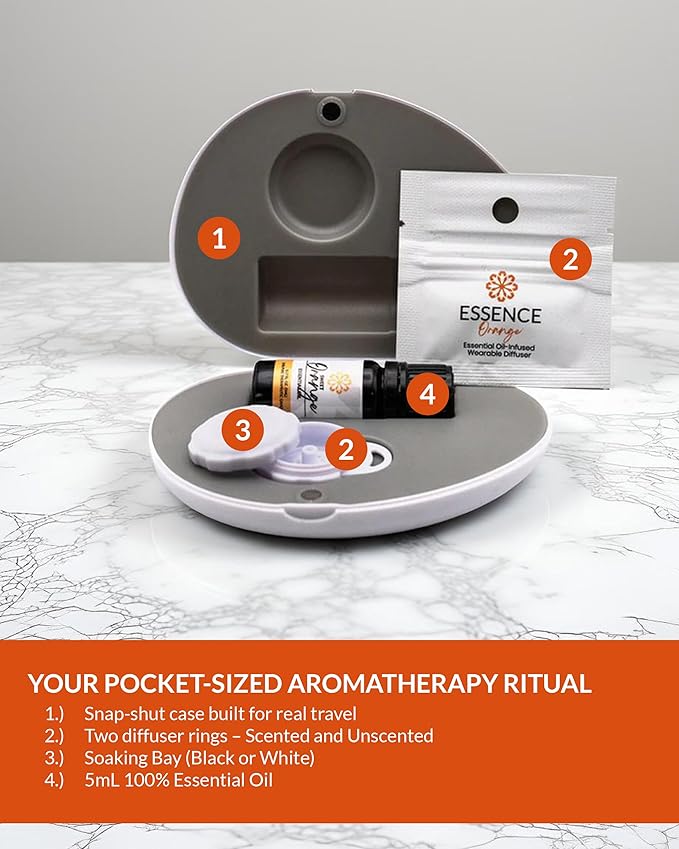 Essence Pearl Travel Case - Wearable Aromatherapy Kit with Nasal Diffuser Rings, Soaking Bay, and 5mL Essential Oil – Portable Wellness Gift Set for On-The-Go Self Care