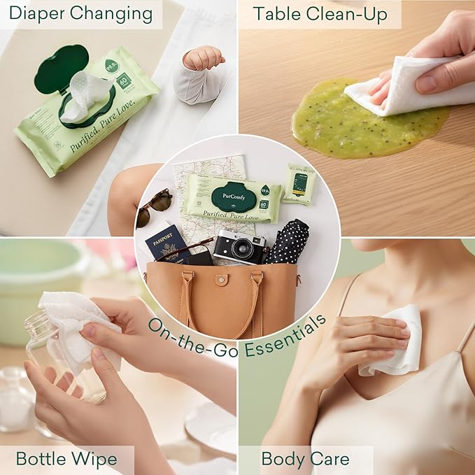 - Ready for Every Moment: Whether you're handling big messes at home or quick cleanups on the go, PurComfy wipes are always within reach. Full-size packs stay ready in the nursery or bathroom, while travel packs tuck easily into your bag, stroller, or car.
