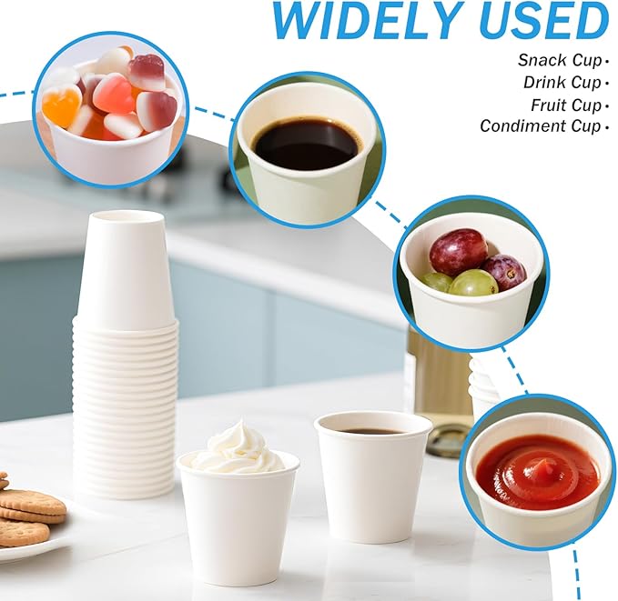 - Classic White Paper Cups: These 3 ounce white paper cups are BPA-free and odorless, making them a worry-free choice for family gatherings, modern parties, children's gatherings, and all kinds of events