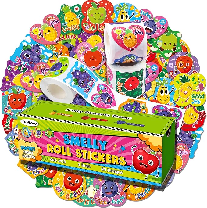 - 🍏 600 Stickers, 24 Unique Designs – Packed with 3 rolls of apple, pineapple, and blueberry scents. Each roll includes 8 fun-shaped stickers (stars, hearts & more) repeating in cycles—kids never get bored!