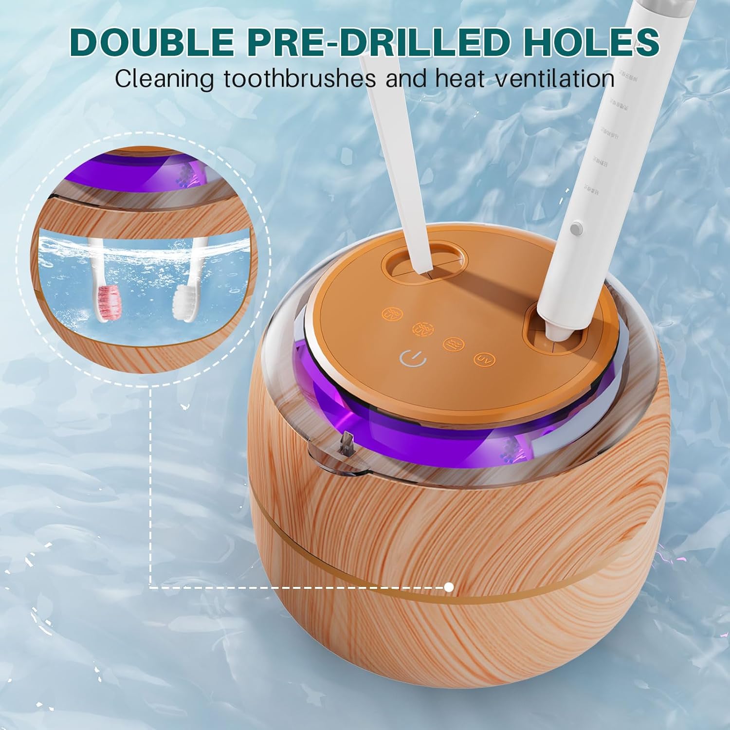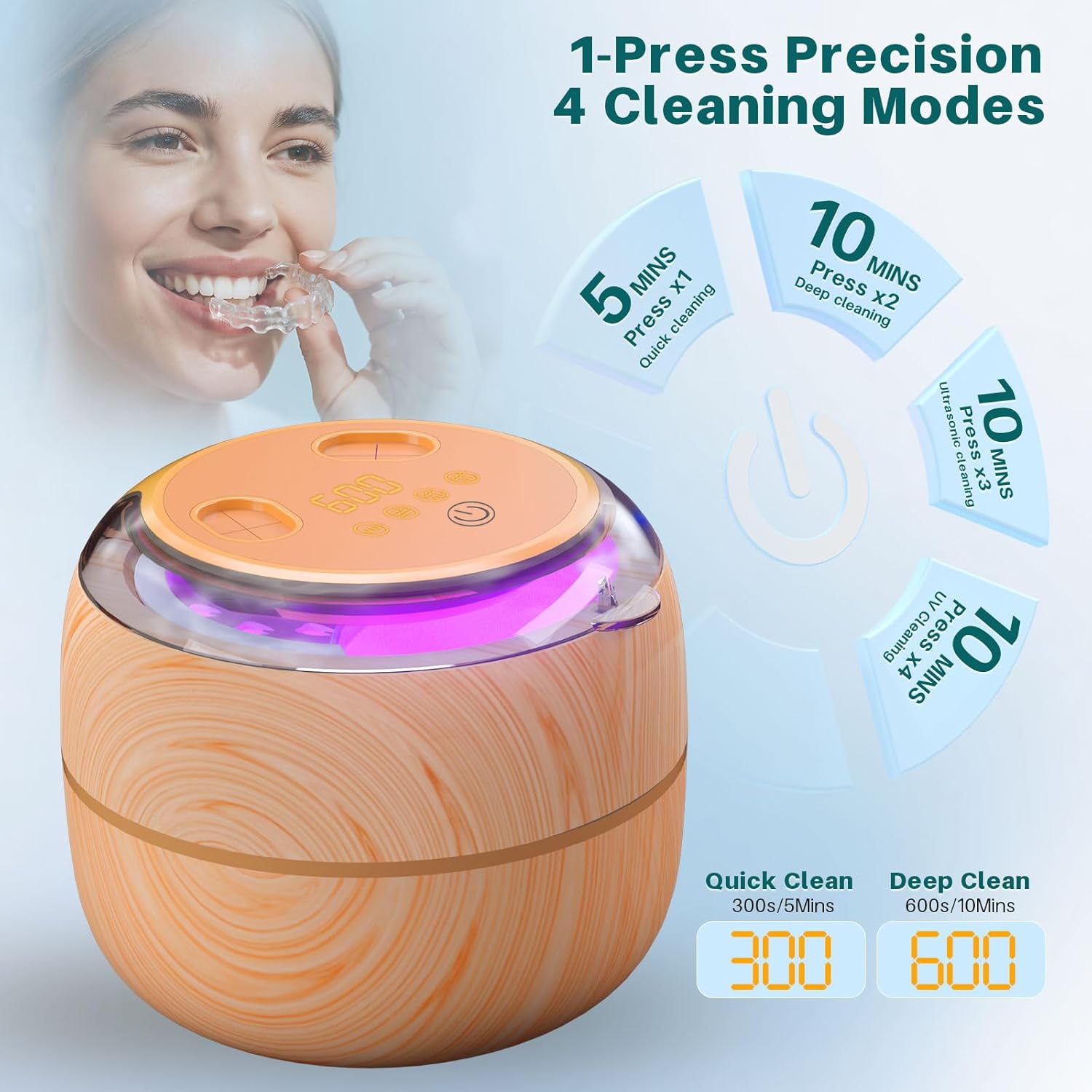 - Stylish Wood-Grain - Retainer cleaner machine in a compact 200ml tank that fits any countertop. Features stylish wood-grain finish to complement modern, while durable ABS housing stainless steel chamber ensures daily durability. The clear lid allows real-time monitoring of micro-bubble cleaning cycles. The double pre-drilled holes design can clean toothbrushes and maintain ventilation. Anti-slip base maintains stability during high-frequency operation