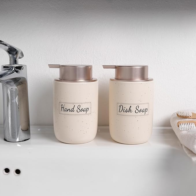 BosilunLife Apricot Soap Dispenser Set - 2 Pack 12oz Ceramic Dish Soap Dispenser with Rust Proof Pump for Kitchen, Hand Soap and Lotion Set Suitable for Farmhouse Bathroom Decor with Waterproof Labels