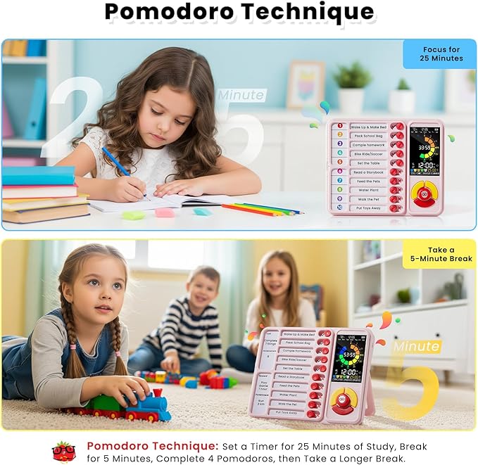 - [5-Alarm System & Pomodoro Technique] Visual timer for kids has 5 alarms that can be set independently. Set alarms for One-Time, Daily, Weekdays, or Weekends. 3-Step Snooze: 5-minute intervals (max 3 snoozes); long-press to cancel instantly.Pomodoro timer Structured Focus: 4 cycles of 25-minute focused sessions and 5-minute breaks.