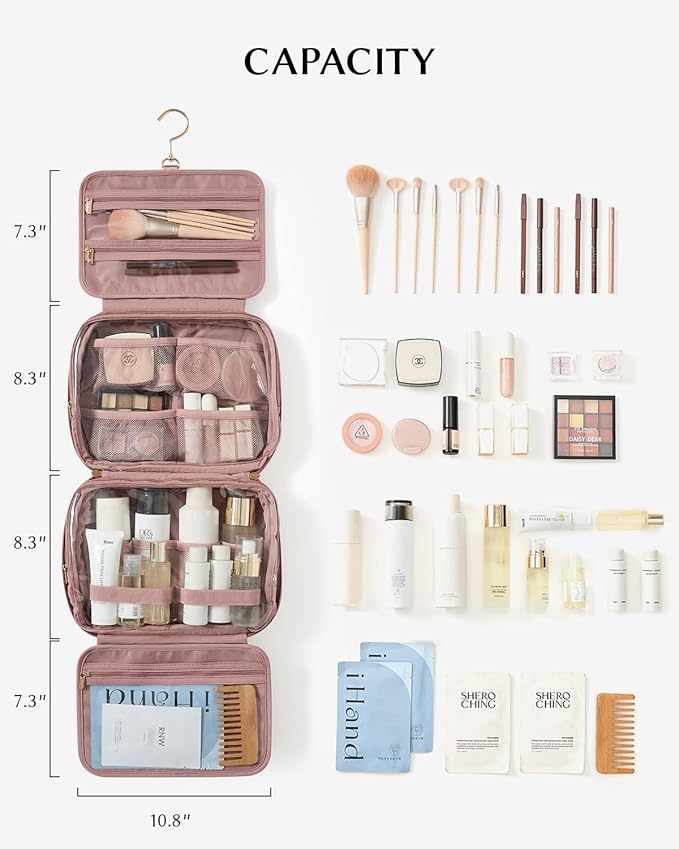 - Generous Capacity:Measuring 11.1" × 3.7" × 7.9", this toiletry bag offers 4 functional compartments to neatly store skincare bottles, brushes, and other travel essentials.