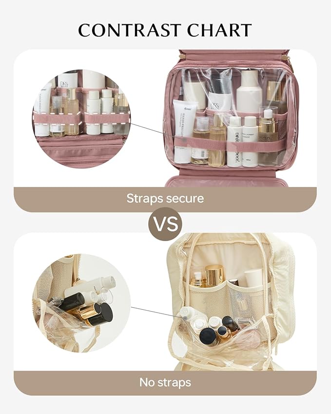 EACHY Travel Toiletry Bag with Hanging Hook, Portable Makeup Cosmetic Bags for Women, Water-Resistant Full-Size Travel Accessories (Pink)