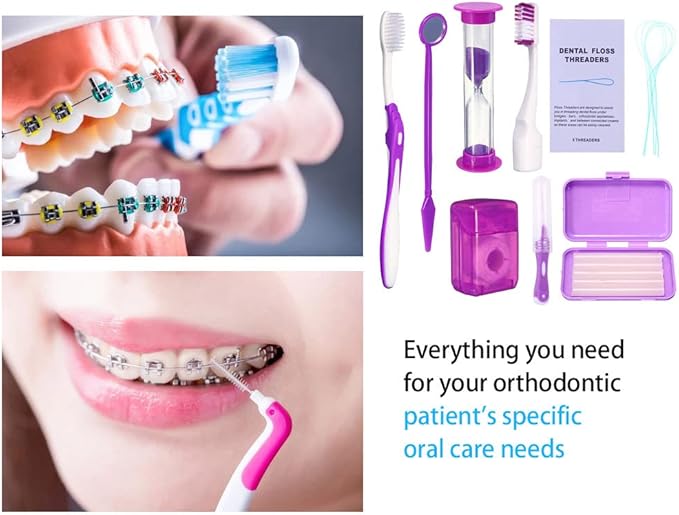 - You will get: 2 x Orthodontic Care Set, Set includes: 2*Orthodontic Toothbrush, 2*Travel Toothbrush, 2*Floss, 2*Dental Mirror, 2*Orthodontic Wax, 2*Interdental Brush, 2*Hourglass Timer, 2 floss threaders,fully meet your daily needs, one for home , one for travel.