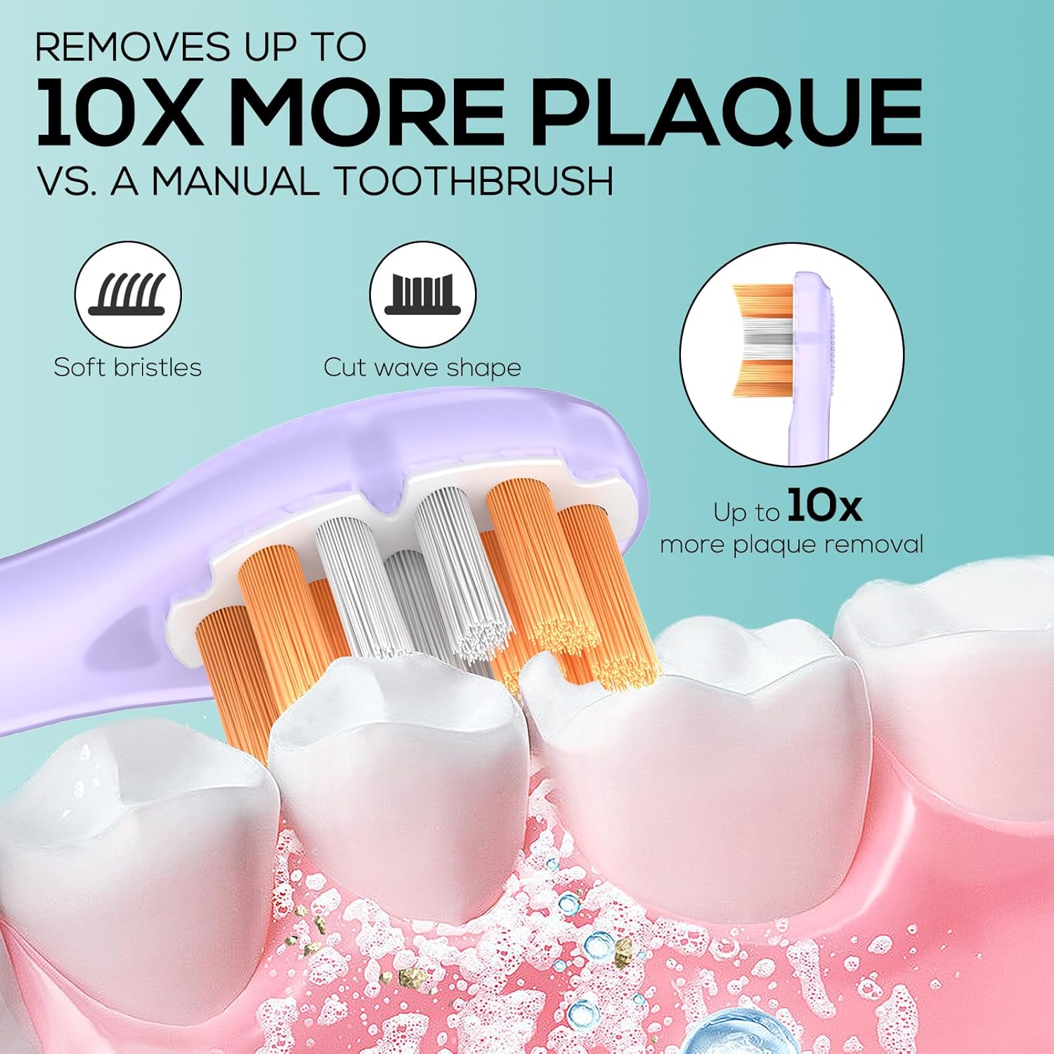 - WAVE-SHAPED BRISTLE DESIGN FOR OPTIMAL FIT: Waveform design dense bristles cover hard-to-reach areas for enhanced sonic cleaning for deeper cleaning. Compared to manual toothbrushes, it is easier to remove stubborn tooth stains and effectively improve the overall health of the gums.