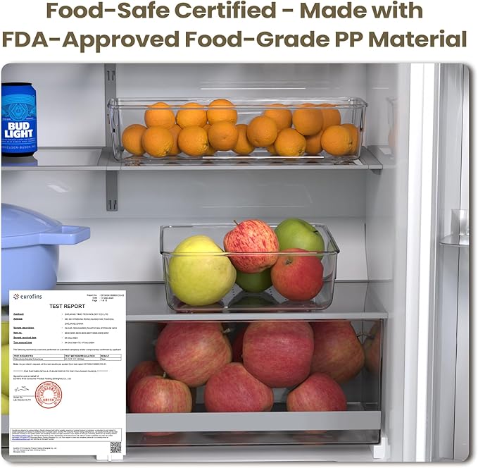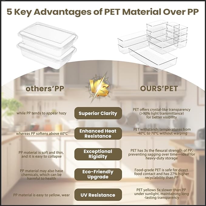 - Premium Material:Our drawer storage boxes are made of PET plastic. Compared to typical PP plastic storage containers, they offer higher transparency, better heat resistance, and food-grade safety—ideal for direct contact with ingredients. PET is also highly recyclable and maintains its shape over time without collapsing, making it the perfect choice for a quality lifestyle.