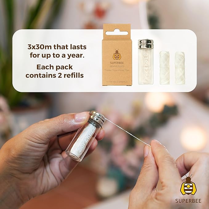 - 3 SPOOLS WITH REUSABLE FLOSS HOLDER - Each pack contains 3 floss spools (30 meters each) and a reusable glass floss holder with an easy to rethread lid to optimise your zero waste bathroom and should last around 12 months.