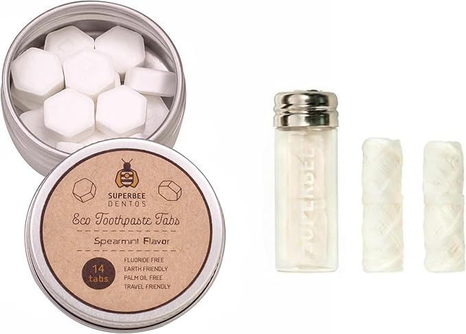SuperBee Dentos Toothpaste Tablets & Dentos Floss, 14 Tabs, Fluoride Free & Eco Friendly, Travel Mouthwash Tablets, Sensitive Bites Kids Adults, Chewable Tablet, Spearmint
