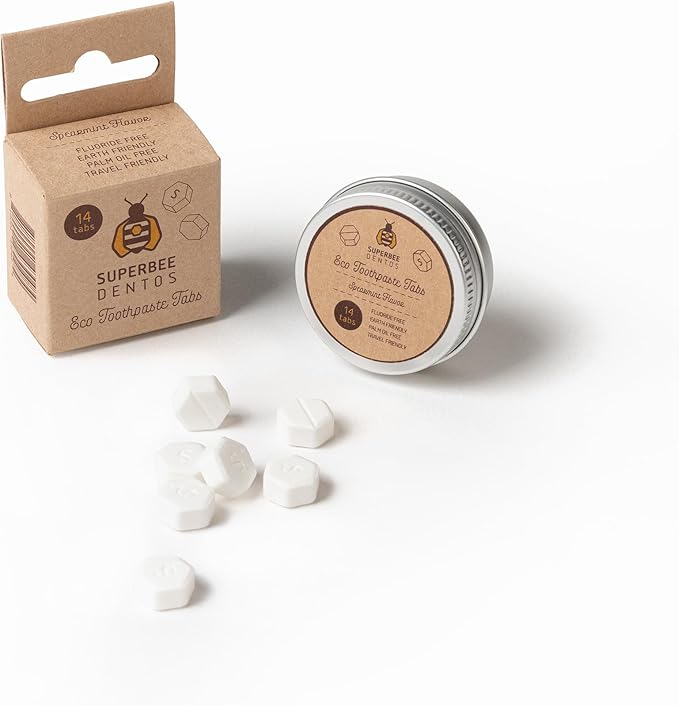 SuperBee Dentos Toothpaste Tablets & Biodegradable Bamboo Toothbrushes, 14 Tabs, Fluoride Free & Eco Friendly, Travel Mouthwash Tablets, Sensitive Bites Kids Adults