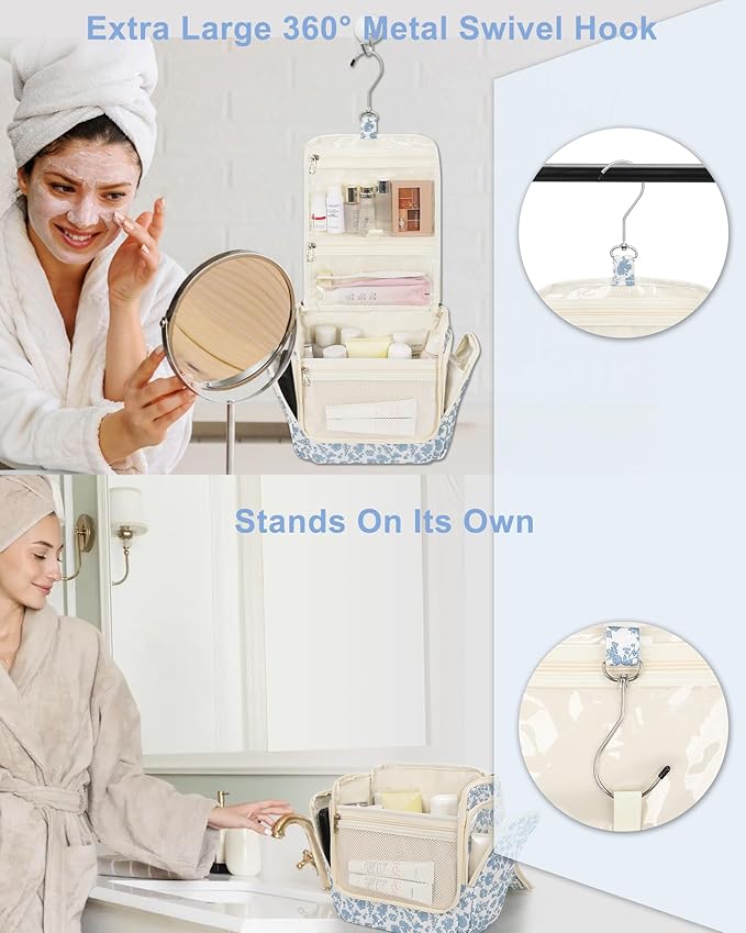 - Convenient Hanging Hook: Comes with a extra large 360° metal swivel hanging hook, big enough allows you to hang the bag anywhere. Keeps its shape when hanging, easy access. More rationalized design than the same type of toiletry bag on the market.
