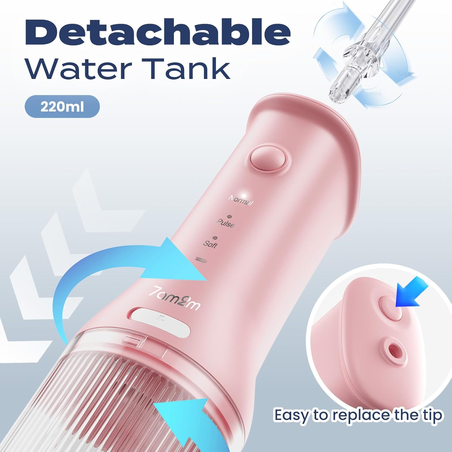 7AM2M Portable Water Flosser Cordless, Water Flosser with 3 Modes and 2 Jet Tips, USB C Rechargeable, IPX7 Waterproof, Dental Water Flosser for Travel and Home Use (Pink)