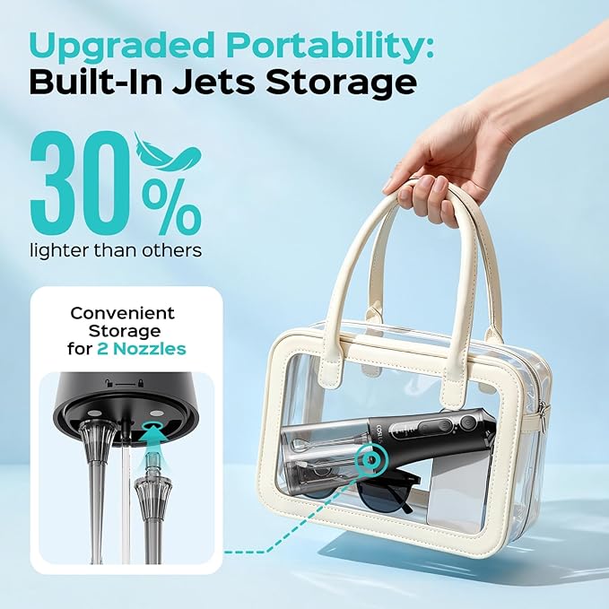 - Upgraded Portability Built-In Nozzle Storage & Lightweight: This portable water flosser stores two nozzles securely inside its compact body—always organized, dry, and ready for use without extra cases. Weighing 30% less than traditional models, water dental picks for teeth cleaning and flossing effortlessly fits in backpacks, suitcases, dorm drawers, or on office desks, making it ideal for students, travelers, business professionals, and those seeking convenient oral care anywhere