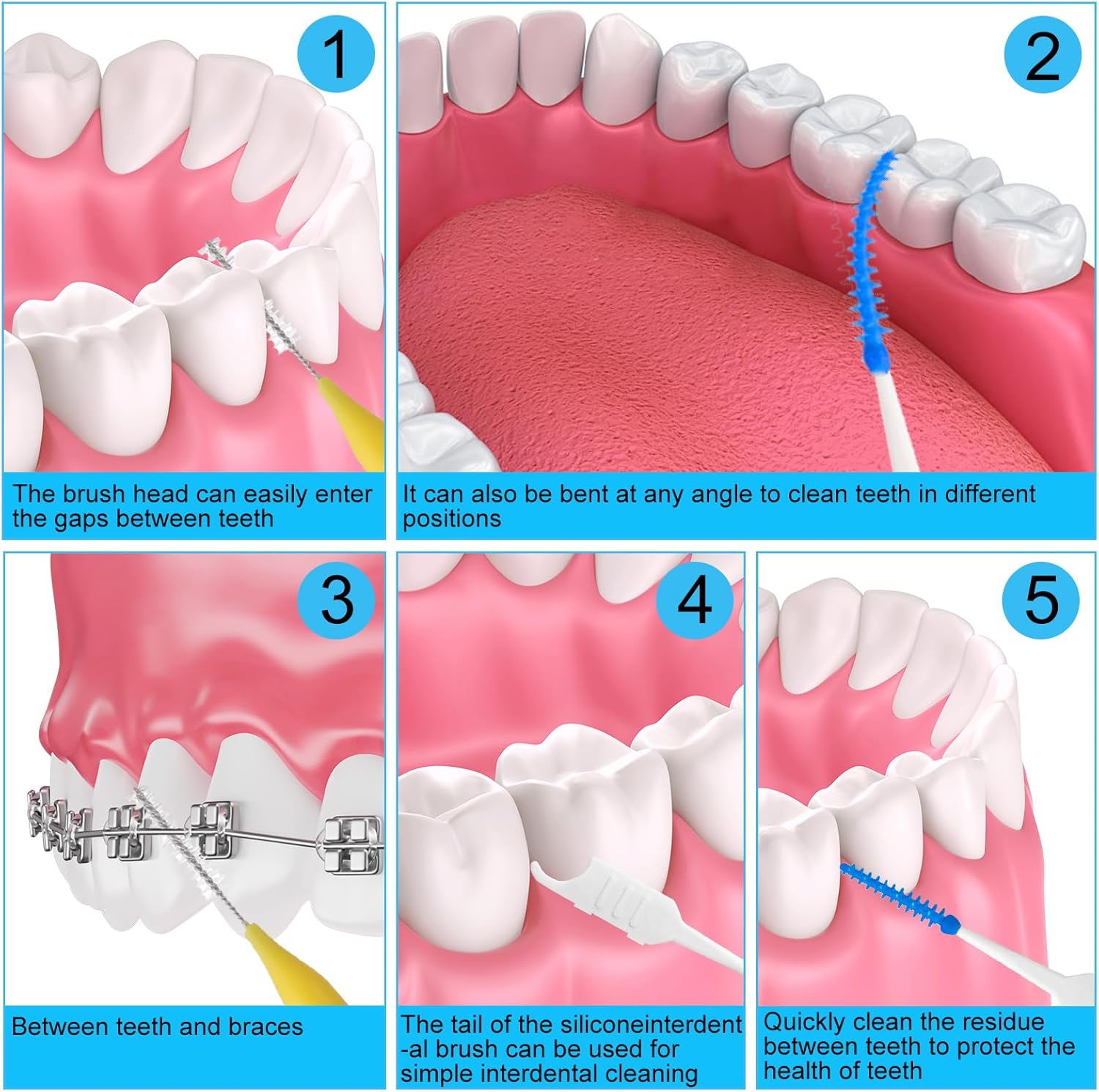 - 【 Soft and Bendable 】: The silicone dental brushes between teeth head is supported by silicone, with moderate hardness and softness. The multi-color toothbrush tip is made of rubber, steel wire and nylon and can be bent at any angle, which can easily reach all areas. It can effectively clean every corner of the teeth.