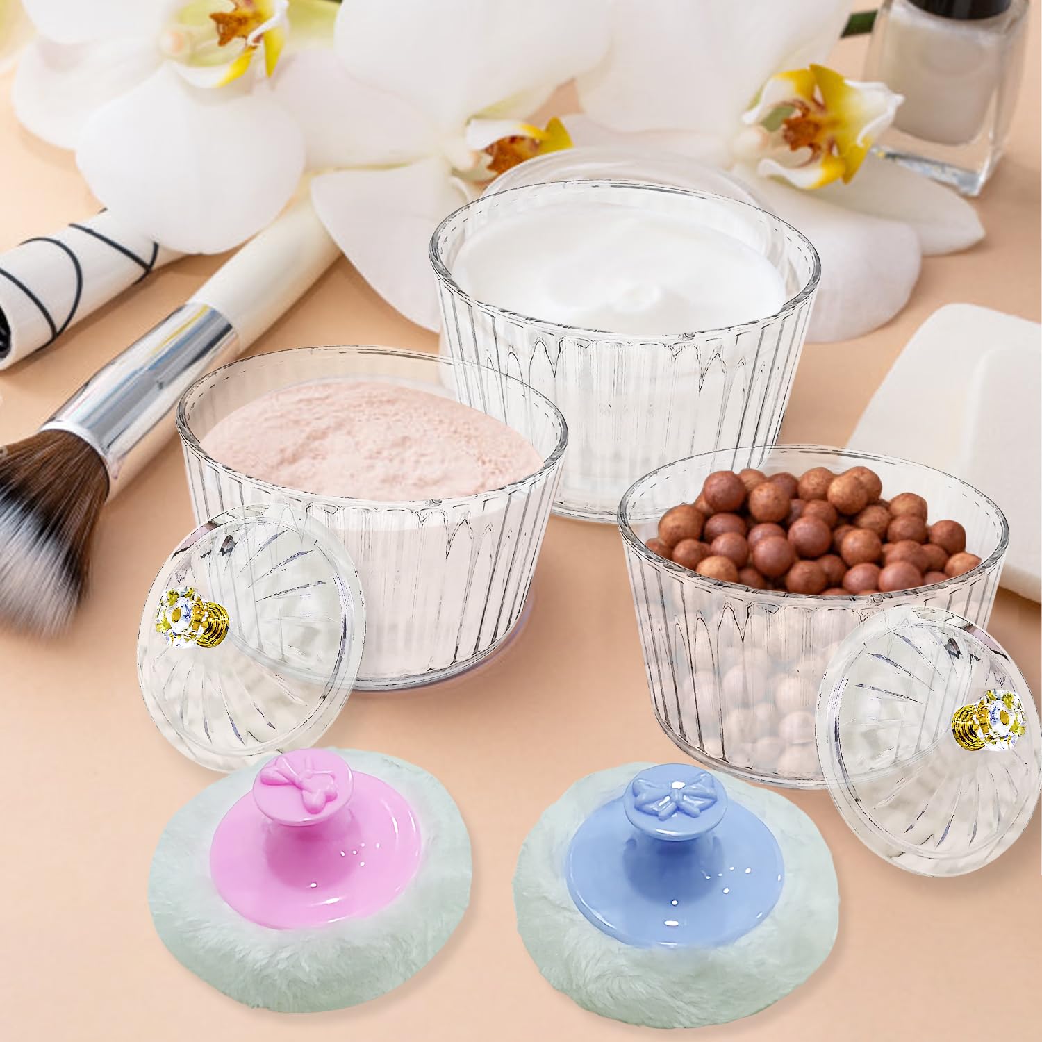 - Package: 1 pcs acrylic powder puff container, 2 pcs acrylic wool fabric powder puff with handle