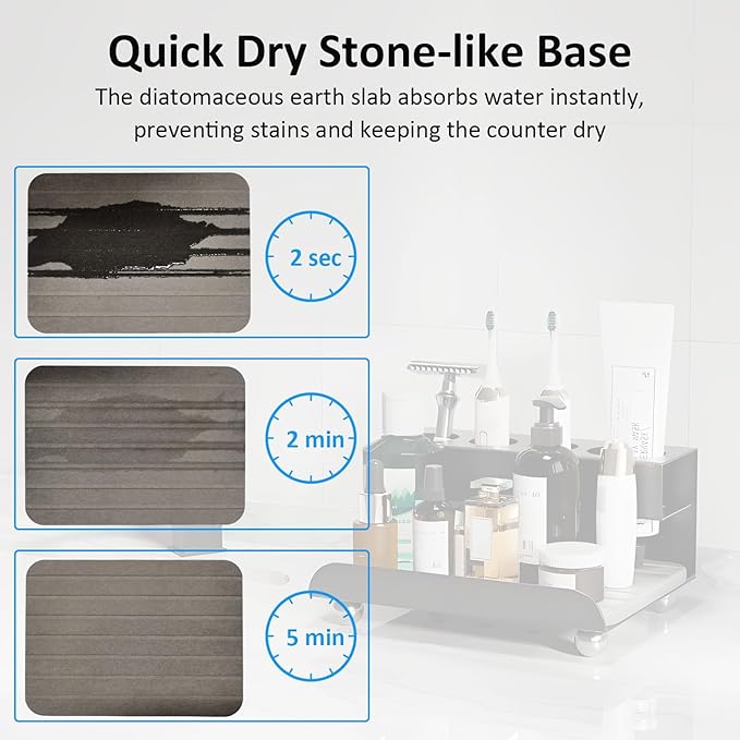 - Quick Dry: Toothbrush holder features a removable, super-absorbent diatomaceous earth slab that sucks water away instantly