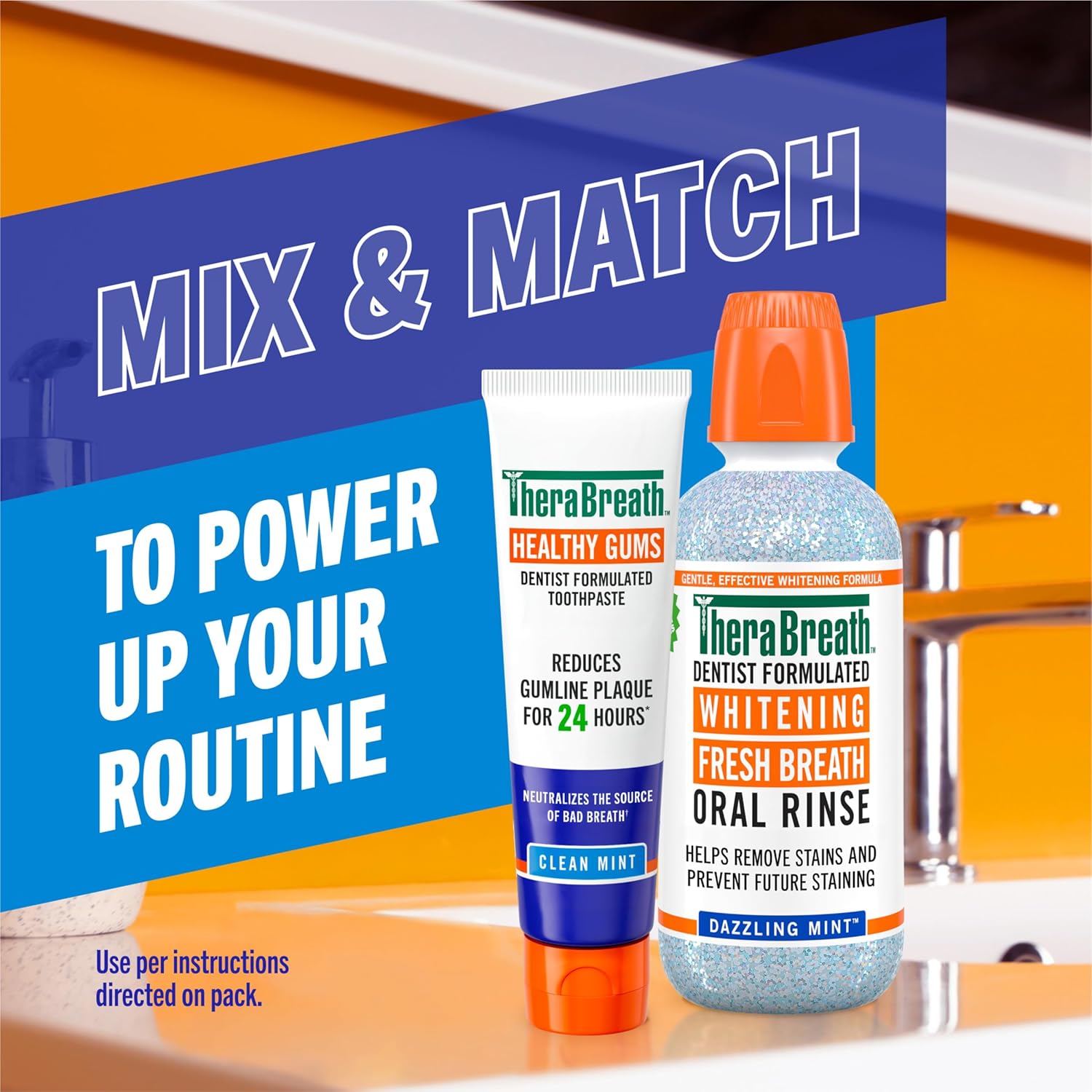 - A pack of two 4 oz TheraBreath Healthy Gums Toothpaste; Clean Mint flavor is long-lasting for epic freshness
