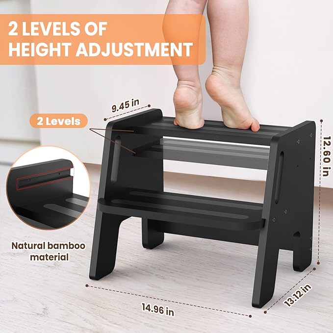Toddler Step Stool, Wooden Height-Adjustable 2-Step Stool for Kids, Potty Training Stool with Handles for Bathroom Sink, Kitchen, Bedroom-Black