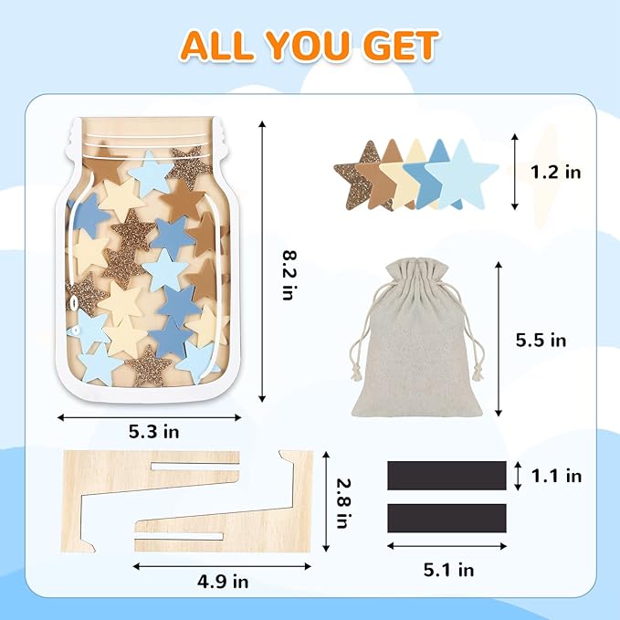- 1. Complete Star Jar Set Includes 1 wooden star reward jar, 25 sparkling acrylic stars, 1 wooden stand, and 2 magnetic strips. A ready-to-use motivational tool designed to make every achievement shine brightly.