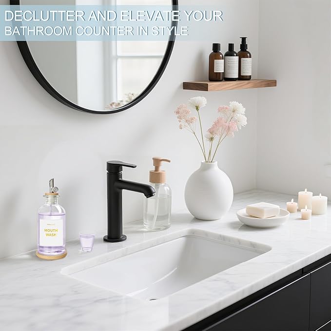- Modern and Sturdy: Mouthwash dispenser is crafted with transparent thick glass material, well sealed and refillable; clear glass bottle can see the color and the left of mouthwash, easy to clean; adds a sleek, natural touch and instantly elevates the look of any bathroom counter