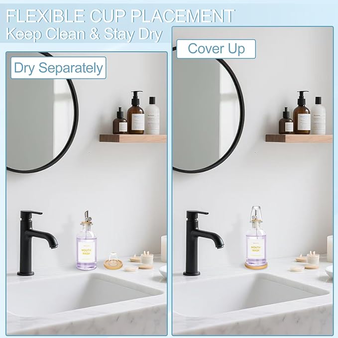 - Flexible Cup Placement: Mouthwash cup can be placed separately to dry, or inverted over the spout to stay clean and ready to reuse; when the cup is drying on its own, the auto flip-top spout closes firmly to prevent dust and moisture buildup; no need to worry about the spout being exposed before fully drying
