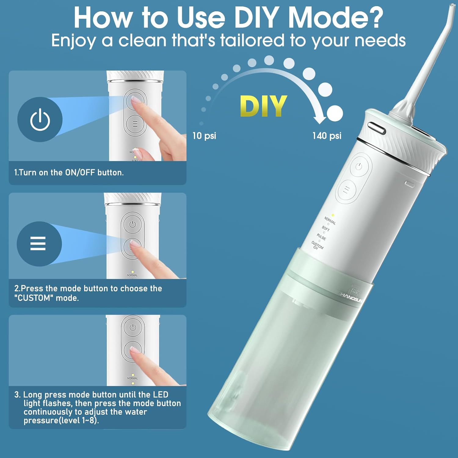 - 3+1 Modes and 8 Pressure Settings : Customize your clean: With 3 modes (including Soft for sensitive gums) and one custom mode with 8 adjustable pressure levels, you can personalize your flossing experience for maximum comfort and effectiveness. Ideal for those with sensitivity, braces, crowns, or gum issues—and great for the whole family