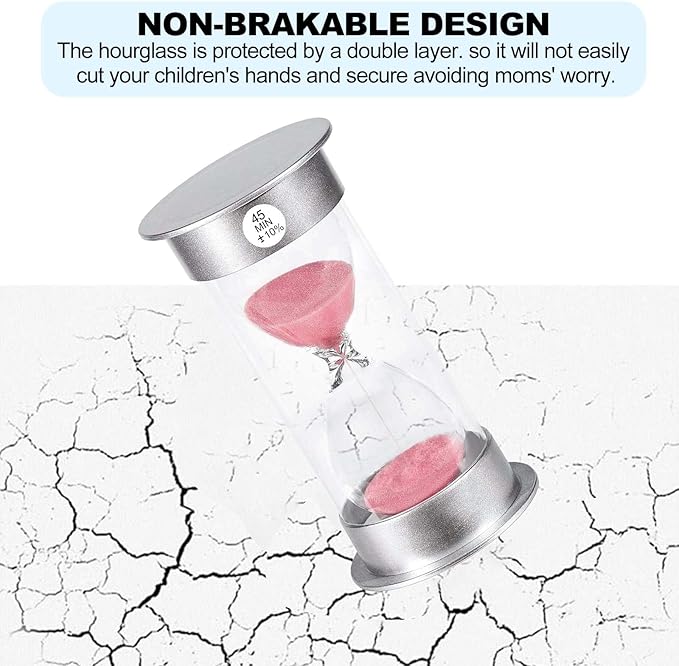 - Safety Hourglass Timer: The 45-minute sand timer made by friendly high borosilicate glass and acrylic material. And each hour glass has a digital time mark. easy to distinguish which timer for which usage