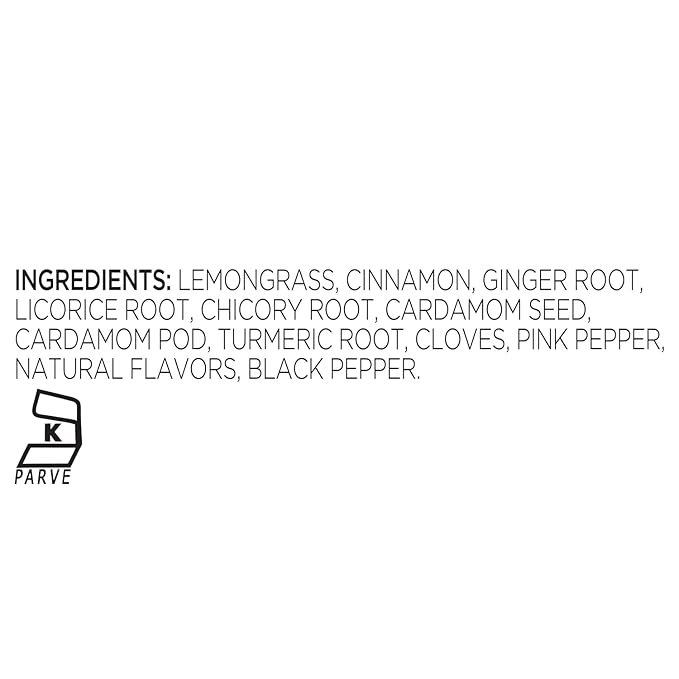 - INGREDIENTS - Lemongrass, Cinnamon, Ginger root, Licorice root, Chicory root, Cardamom seed, Cardamom pod, Turmeric root, Cloves, Pink pepper, Natural Flavors, Black pepper.