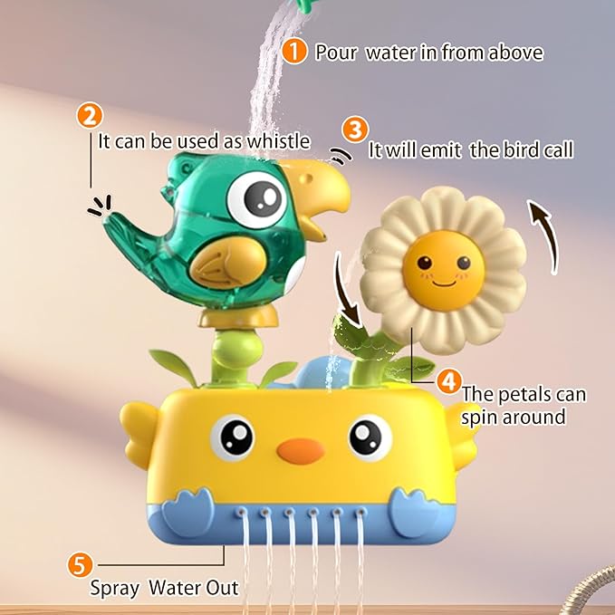 - 【INTERACTIVE DESIGN】This adorable baby bath toys consists of two parts, cleverly integrating a variety of cute designs—it features cute animal figures like bright-colored birds, a sunflower shape, and is also paired with a tiny watering spoon,The set comes with two fun interactive highlights: first, a rotatable flower component, and second, a bird-shaped piece that can spray water. What’s more, the bird emits realistic chirping sounds, creating a joyful bath time experience for your baby.