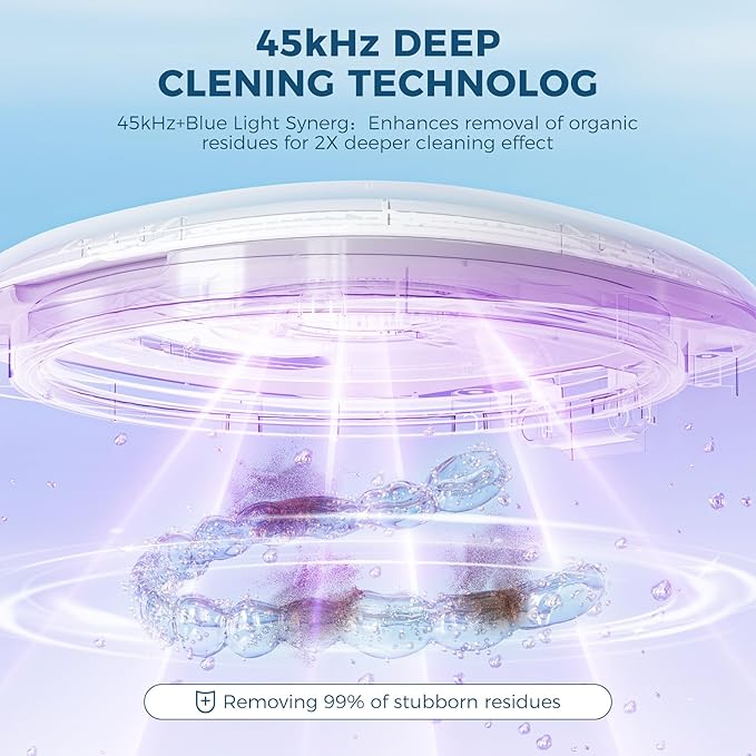 - 【Upgraded Ultrasonic Cleaner】 Featuring 45kHz clinic-grade ultrasonic technology, this retainer cleaner generates high-frequency vibrations and dense bubbles that penetrate deep into braces, crevices, and grooves to effectively remove stains and plaque— all without causing abrasion to your dental appliance. Sonic dental cleaner for retainers, dentures, braces, night guards, toothbrushes, jewelry, razors, and other small items.