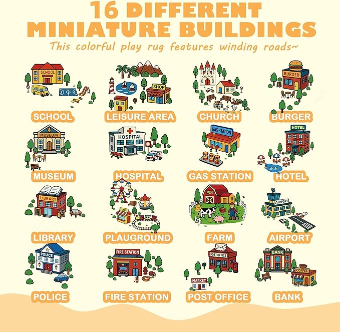 - CITY MAP DESIGN: This kids’ car track carpet features 18 different city buildings—including a hospital, farm, gas station, hotel, library, police station, church, fire station, school, market, post office, burger shop, ticket booth, museum, bank, coffee shop, and airport. Designed with high-definition graphics, each building and word is easy for children to recognize, making playtime both fun and educational.