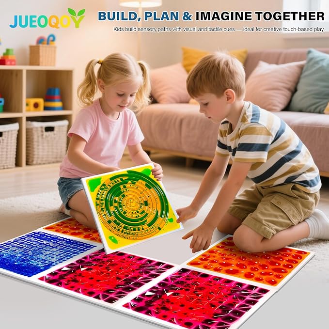 - Color & Texture Discovery: This 4-pack of 12" tiles features swirling liquid in vivid colors and ridged surfaces. Kids step, feel, and watch as each tile creates a playful mix of visual tracking and tactile sensory input for calm, active play