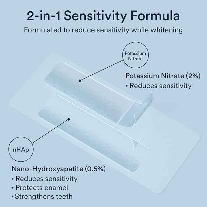 - [LOW SENSITIVITY FORMULA] Auraglow whitening strips are formulated with dual protection against sensitivity: potassium nitrate which is the same ingredient used in sensitivity toothpaste and nano hydroxyapatite, another key ingredient that reduces sensitivity and also protects enamel.