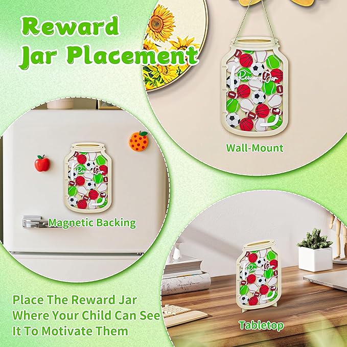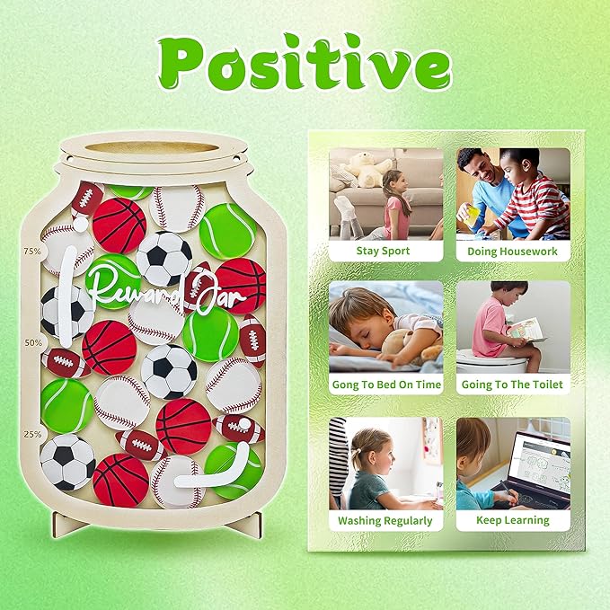 - Creative Design: The kids' wooden reward jar features a sleek and stylish design, decorated with fun and sporty football, basketball, baseball, tennis, and rugby logos—perfect for little athletes! This toddler reward jar is a versatile behavior management tool for the family. It provides three display methods: the wooden stand is suitable for desktop placement, and the strong magnet can be fixed on the blackboard or refrigerator, and can also be hung with hemp rope