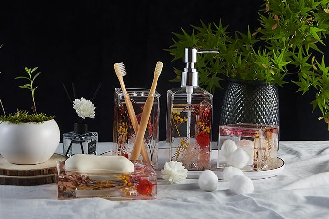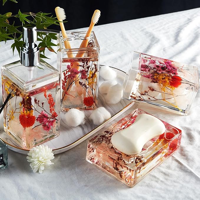 Locco Decor 4 Piece Acrylic Liquid 4D Floating Motion Bathroom Vanity Accessory Set Garden Botanic Pink Plants Toothbrush Holder, Tumbler, Soap Dispenser, Soap Dish