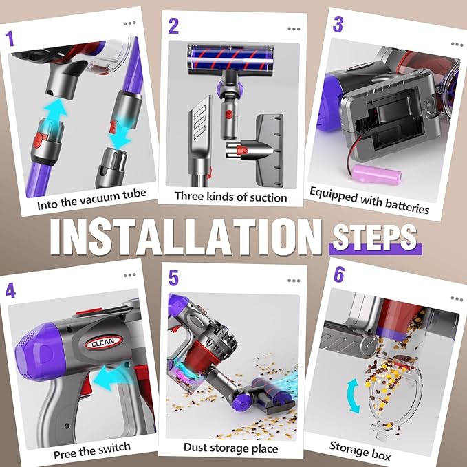 - 【Simulated adsorption】Our kids vacuum cleaner features a simulated suction design. While its suction power doesn't match professional cleaning equipment, its appearance and operating sounds effectively mimic real cleaning scenarios, satisfying children's role-playing needs.