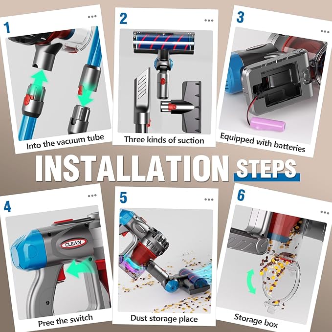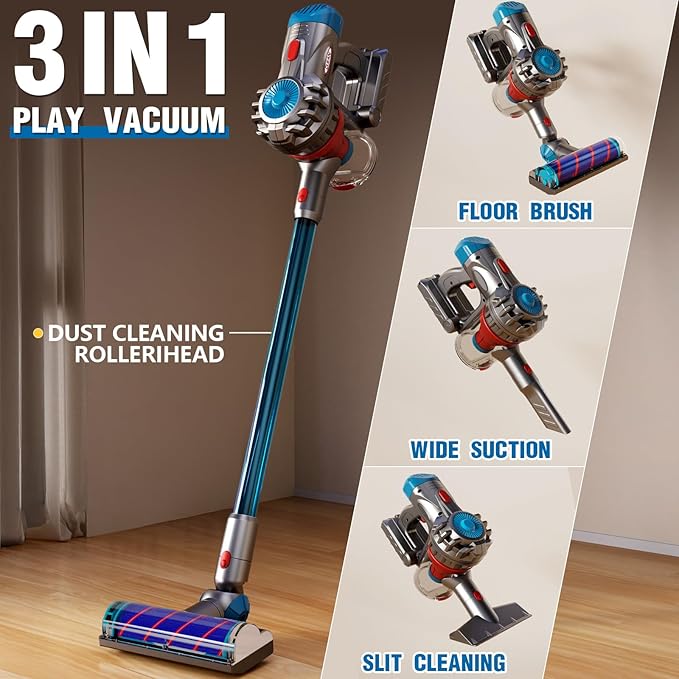 - 【Fun Gameplay】Switch between four different cleaning attachments at will, supporting both automatic and manual modes. Whether it's smooth floors, furniture crevices, soft sofas, or bed corners, it handles them all with ease. This 4-in-1 multi-functional vacuum toy set lets children experience the joy of cleaning while playing, fostering hands-on skills and a sense of responsibility.