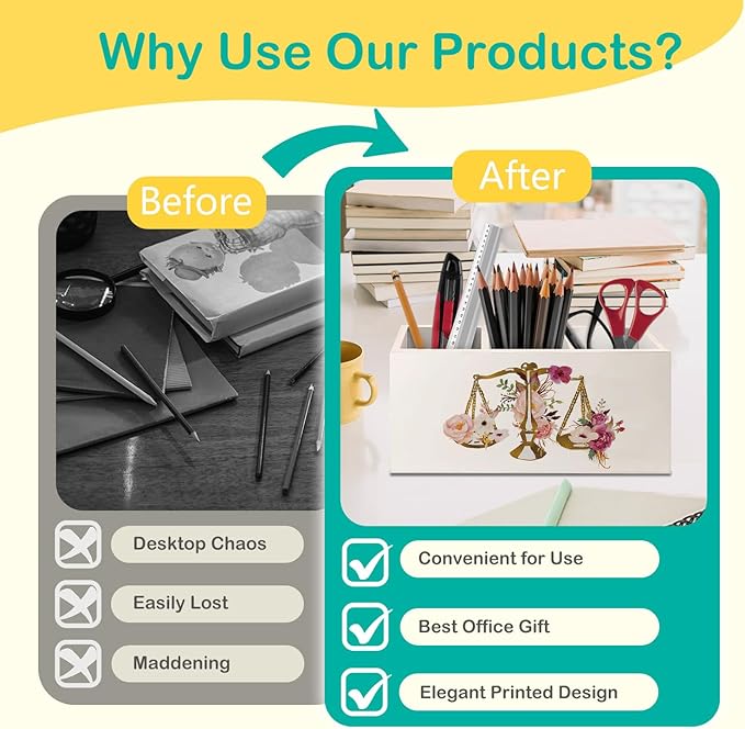 Lawyer Attorney Gifts for Women Pen Pencil Holder for Desk, Lawyer Graduation Gifts, Floral Scales of Justice Wooden Box Decorative Sign for Home Office Desk Tabletop Decor