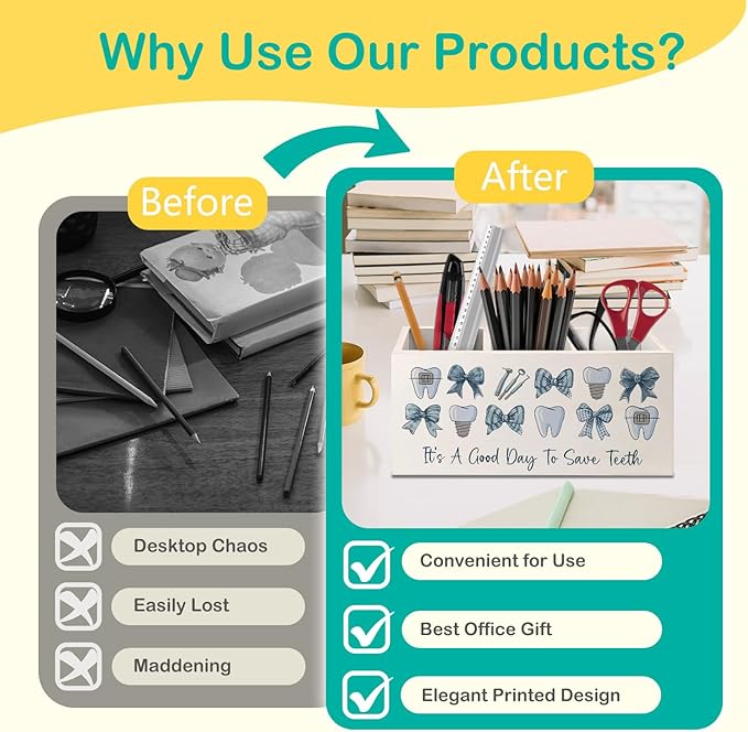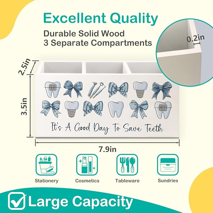 Dental Gifts Pen Pencil Holder for Desk, Dental Hygienist Gifts, Coquette Blue Bow Dentist Wooden Box Decorative Sign for Dentist Office Clinic Hospital Desk Tabletop Decor