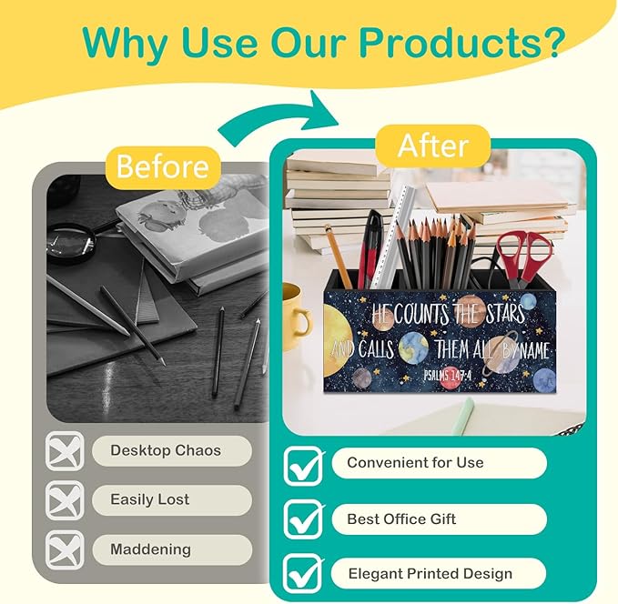 Space Christian Pen Pencil Holder for Desk, Space Nursery Decor, Navy Blue Solar System Bible Verse Decorative Sign for Toddler Nursery Kids Boys Room Desk Tabletop Decor