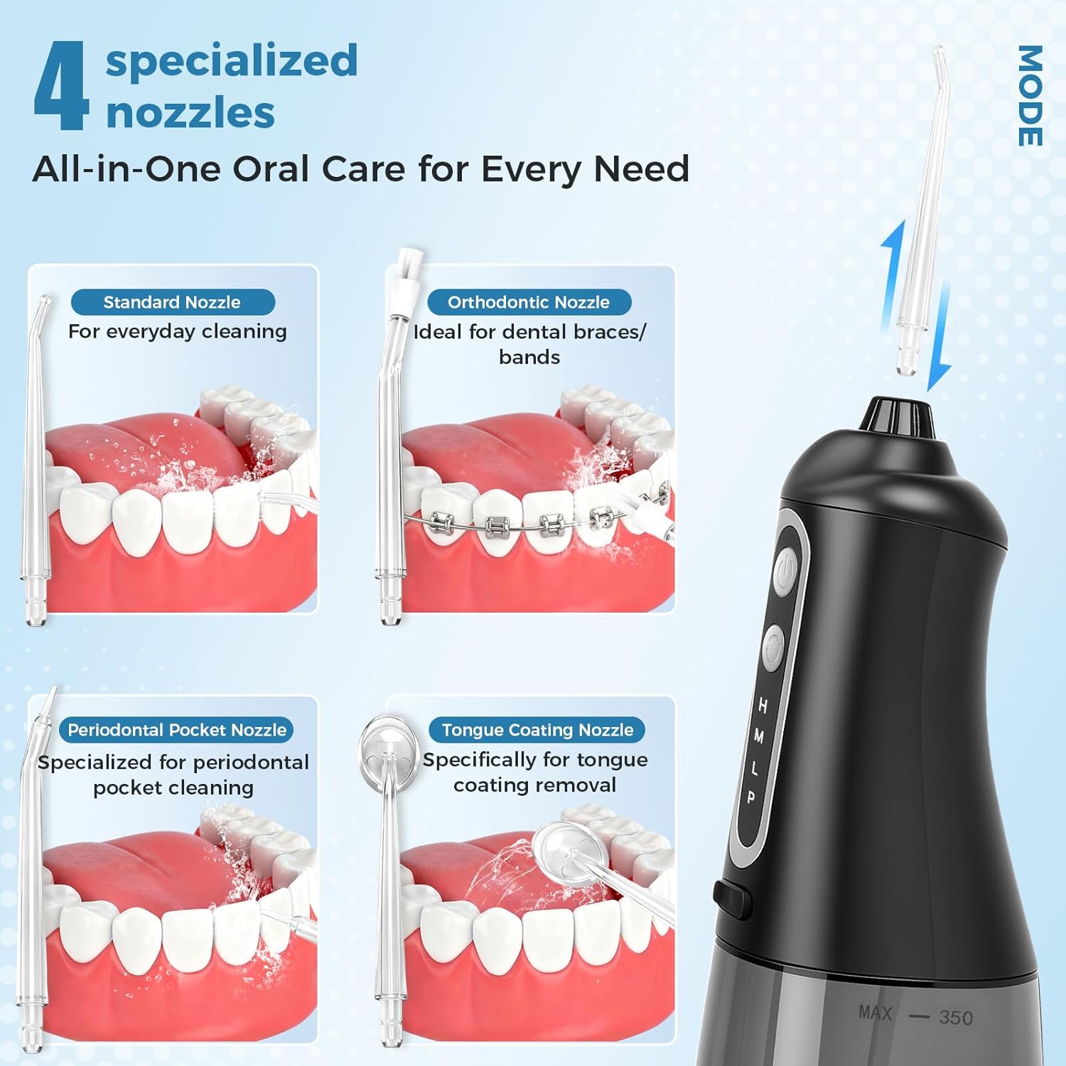 - All-in-One Oral Care for the Whole Family -- Equipped with 4 specialized nozzles, it tackles every need: soft care for sensitive gums, deep cleaning for hard-to-reach spots, even precise cleaning around braces or dental implants. Making oral hygiene a total breeze for all age. Everyone gets healthy gums and a smile that shines bright!