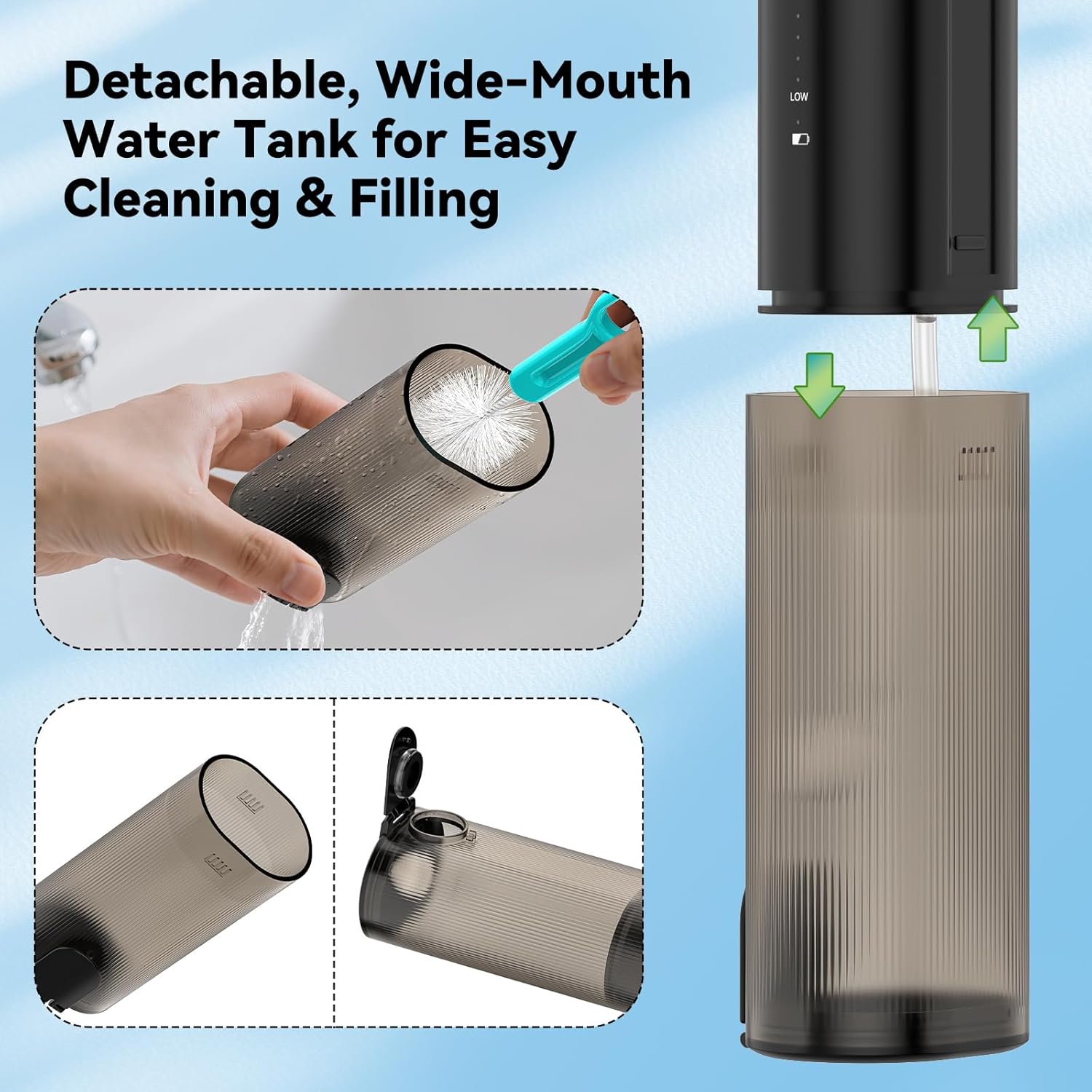 - Compact Design with Collapsible Water Tank – Easy to Fill, Clean and Store:Comes with a 200ml collapsible and detachable water tank that makes storage simple and supports easy daily refills and cleaning. The wide opening allows quick water filling and thorough rinsing. Built with IPX7 waterproof protection, The flosser is safe to use and rinse directly in the bathroom